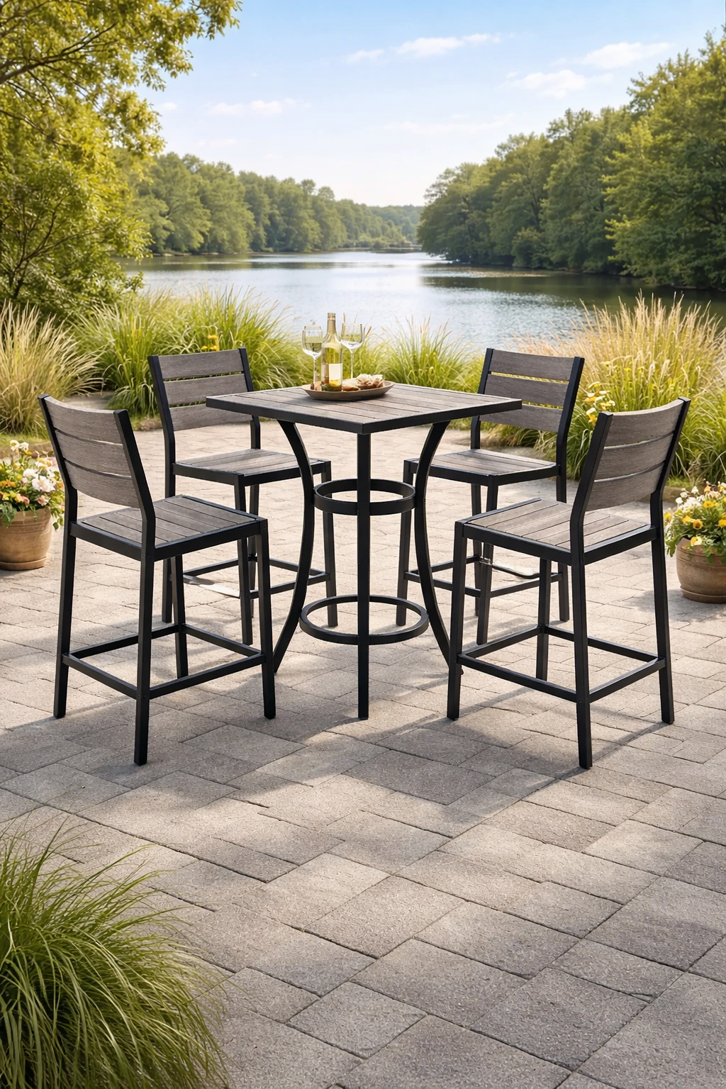 Ensemble de bar en aluminium et bois composite avec table haute et chaises