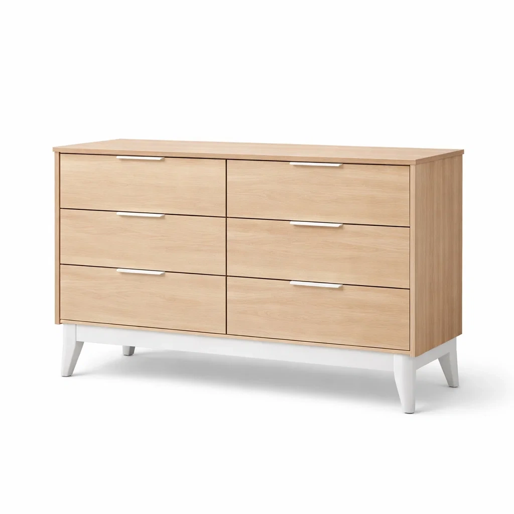 La commode est fabriquée en panneaux de particules stratifiés, offrant six tiroirs pour le rangement. Les tiroirs sont munis de poignées en aluminium. Avec des dimensions de 120 cm de longueur, 40 cm de largeur et 75 cm de hauteur, cette commode allie fonctionnalité et design moderne.