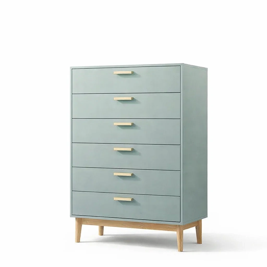 La commode est fabriquée principalement en bois MDF avec une finition en vernis. Elle mesure 130 cm de hauteur, 80 cm de largeur et 40 cm de profondeur. Elle dispose de 6 tiroirs pour le rangement. Les poignées et les pieds sont en bois massif.