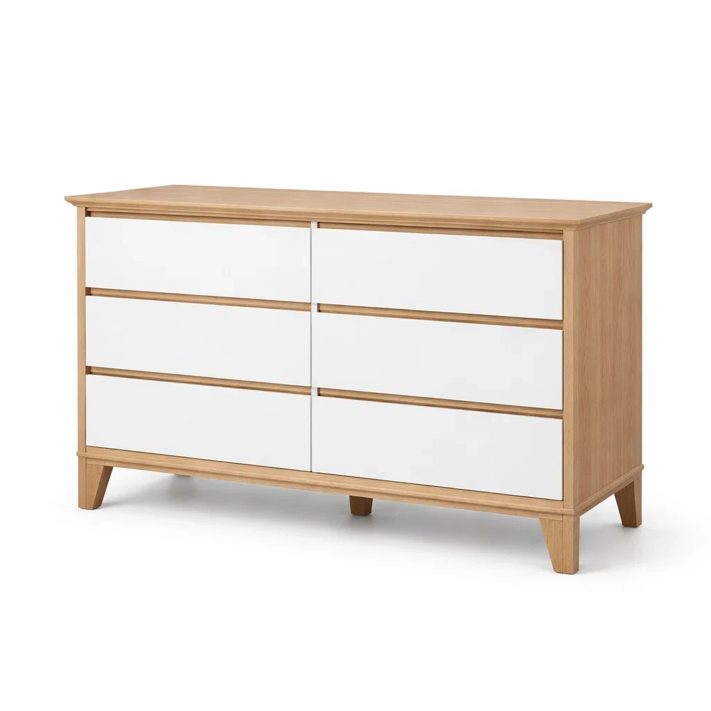 Cette commode de six tiroirs est fabriquée en MDF avec une finition en mélamine. La structure principale est en bois d'ingénierie avec une surface couleur blanche et des côtés en chêne.